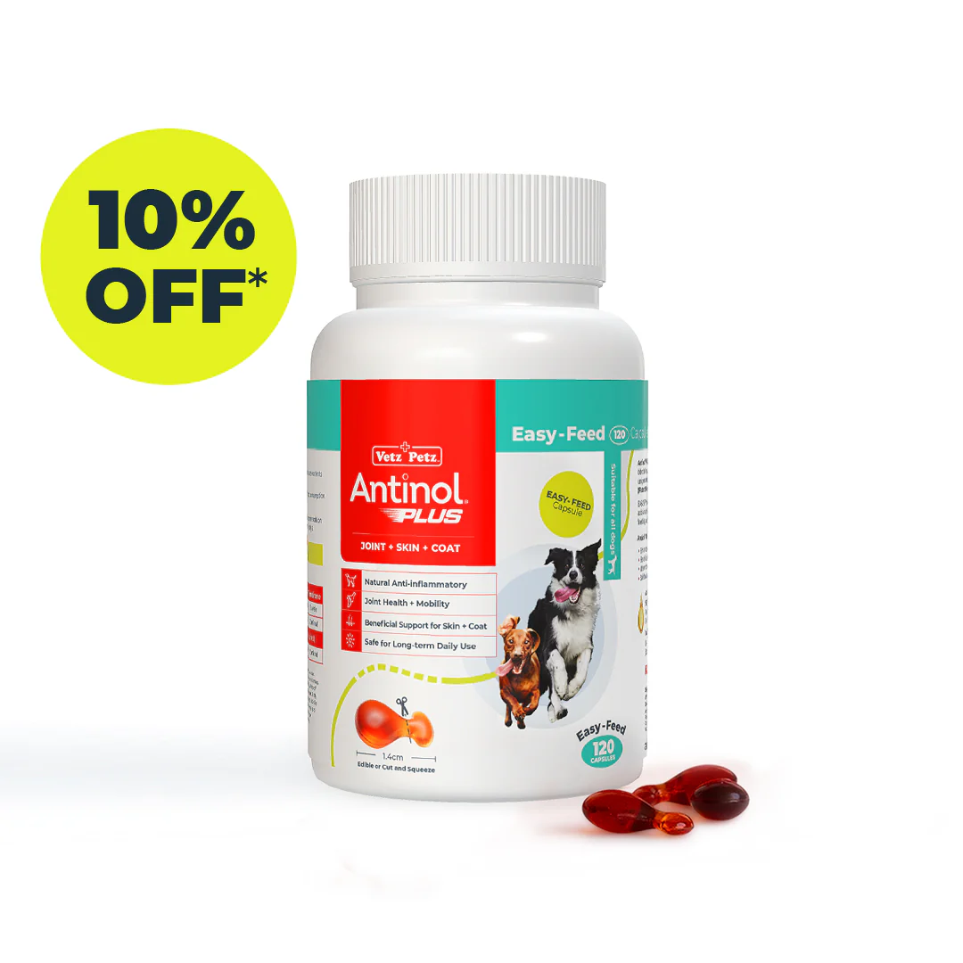 Antinol® Plus is an all-natural supplement that’s changing dogs' lives for the better. Each tiny capsule is made from a patented blend of marine lipid oils that are fully traceable, sustainably sourced, and free from preservatives and fillers. Antinol® Plus supports joints, mobility, skin and coat health, and overall wellness.